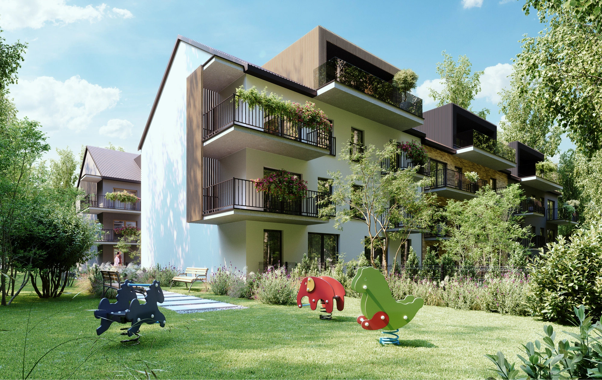 Harmonia Dębskiego to kameralne osiedle sześciu budynków w niskiej zabudowie, które łączy nowoczesną estetykę z funkcjonalnością. Jasne elewacje z dekoracyjnymi detalami i duże przeszklenia nadają całości elegancji i lekkości, a układ zabudowy sprzyja prywatności mieszkańców. Otoczenie pełne drzew tworzy przyjazny klimat i naturalną barierę od miejskiego zgiełku. To inwestycja, w której przemyślany projekt architektoniczny spotyka się z komfortem codziennego życia – idealny wybór dla osób ceniących spokój, ale nie chcących rezygnować z atutów Krakowa.